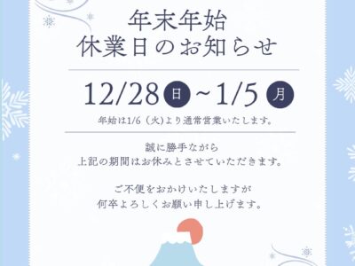 平素は格別のご高配を賜り、厚く御礼申し上げます。 誠に勝手ながら、12/28(日)~1/5(月)まで年末年始休暇とさせていただきます。 休暇期間中にいただきましたお問い合わせにつきましては、1/6(火…